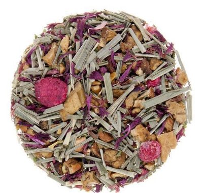 Ingredients: apple pieces, lemon verbena, lemon grass, hibiscus, lemon pieces, raspberry pieces, cornflower petals